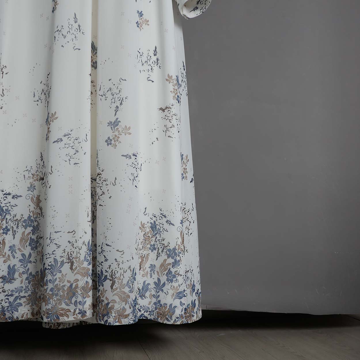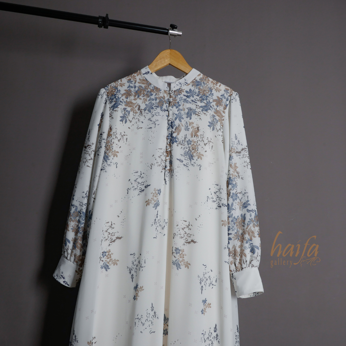 Gamis dari bahan sifon print warna dasar putih tulang dengan motif floral gradasi kebiruan mix kecoklatan.
