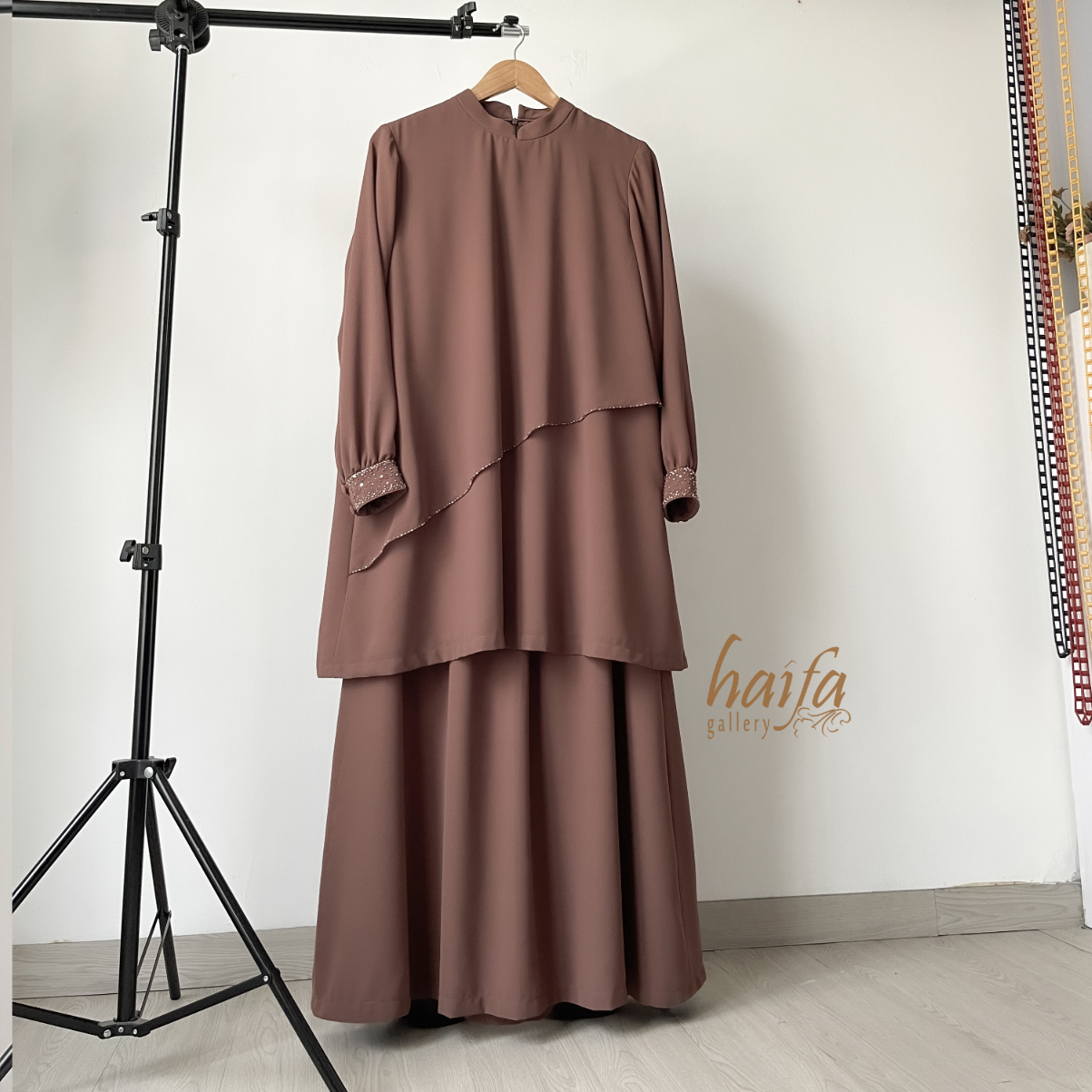 Setelan atasan dan bawahan (rok) dari bahan ceruti warna coklat (dikenal dengan nama coklat milo) dengan lapisan furing full dari bahan katun rayon, aplikasi payet jepang.