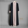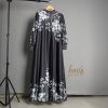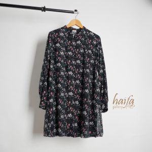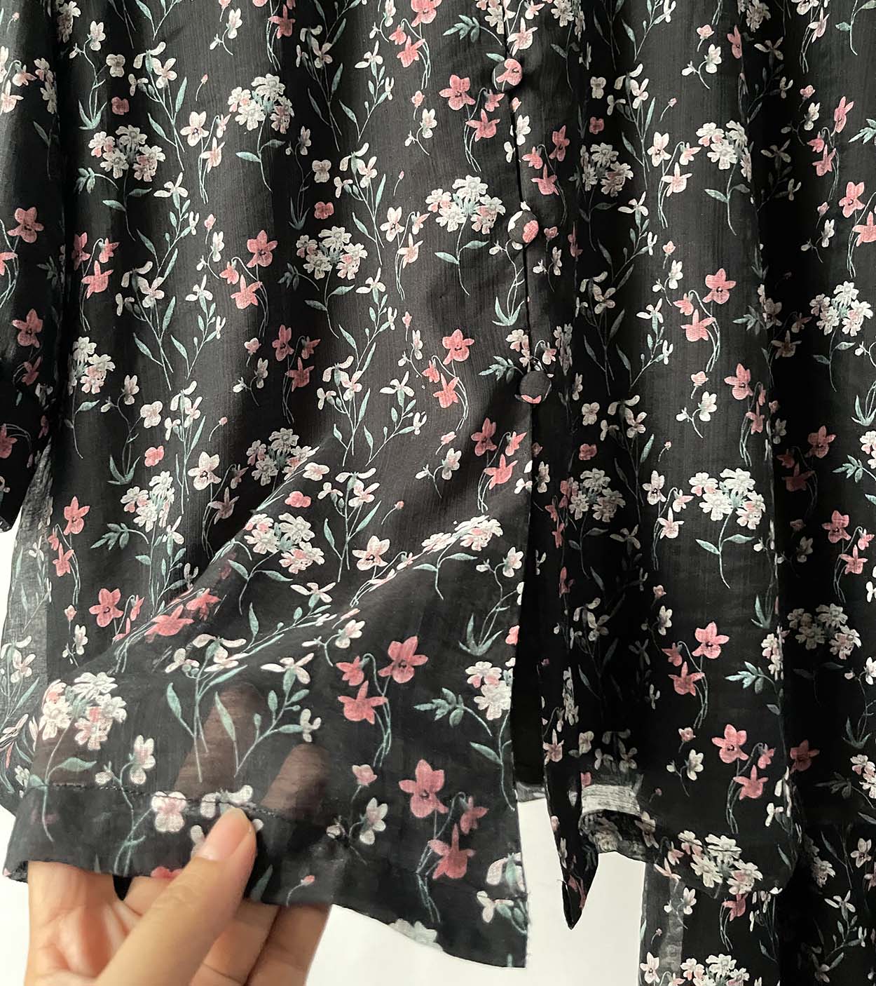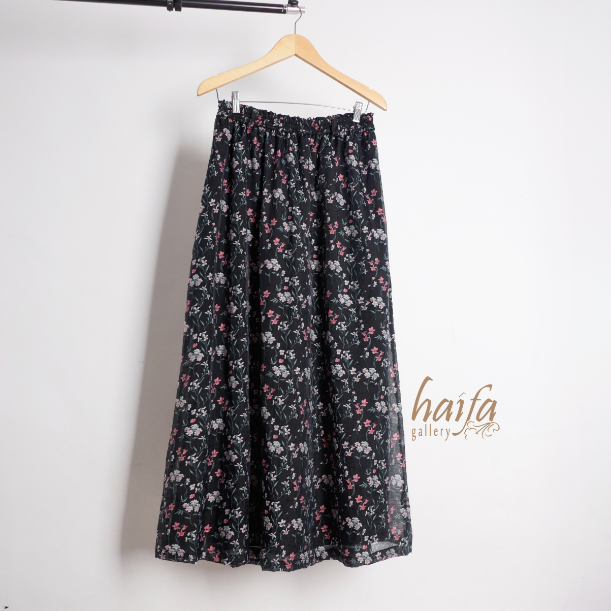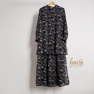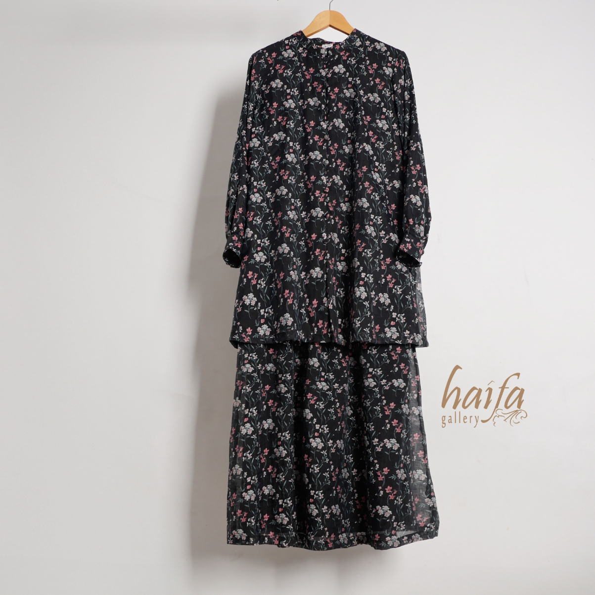 Setelan yang terdiri dari atasan dan rok dari bahan sifon print motif floral warna dasar hitam, motif putih-pink-hijau.