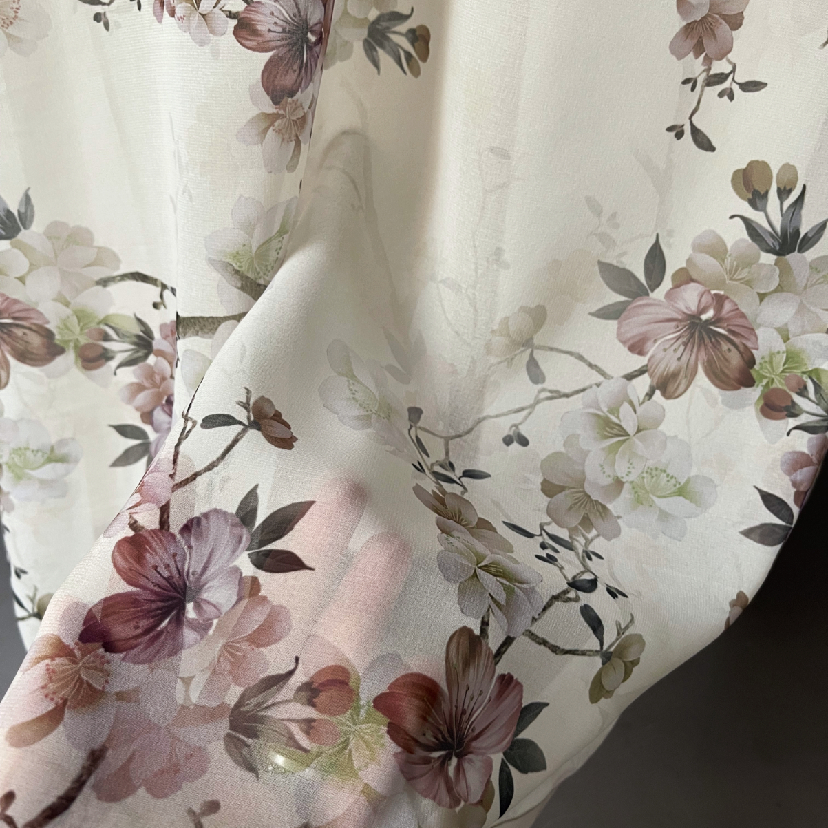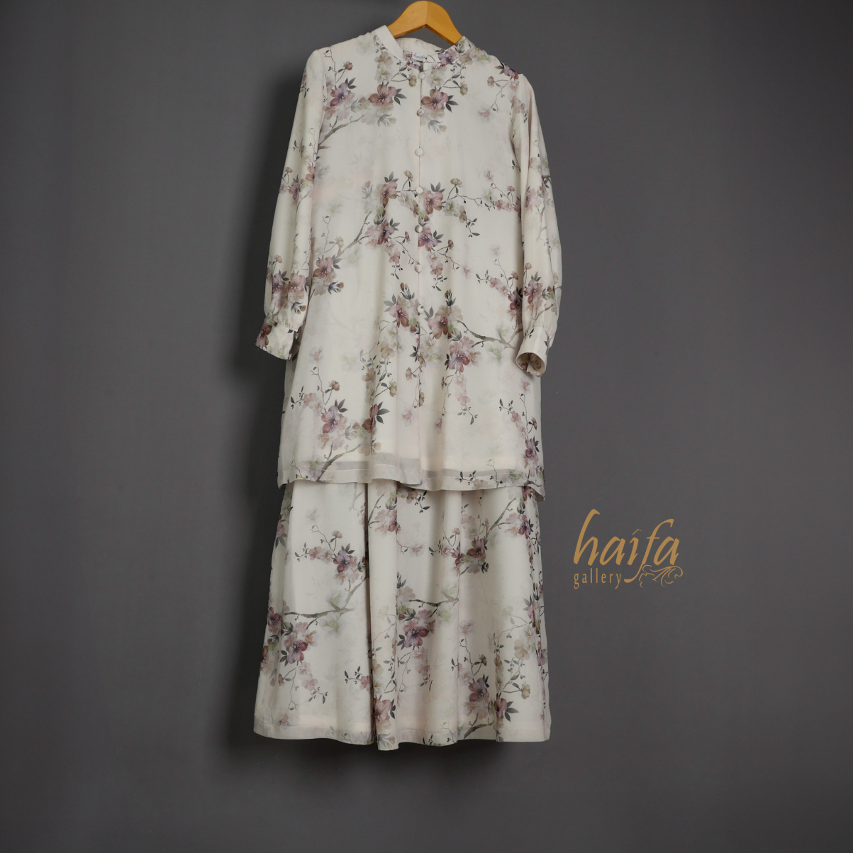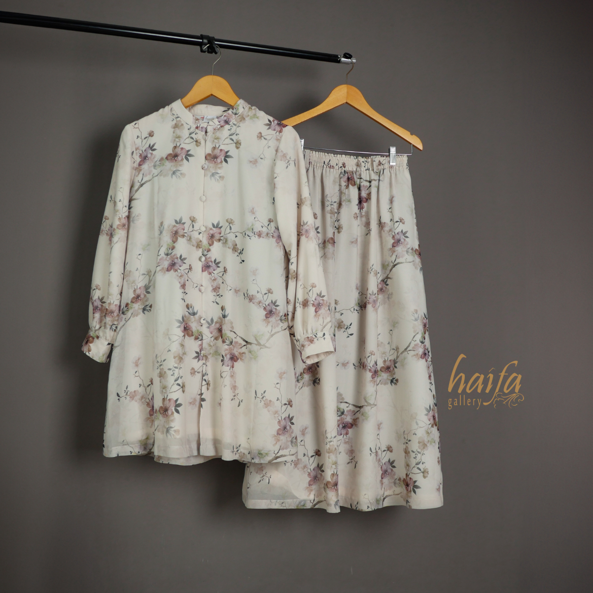 Setelan yang terdiri dari atasan dan rok dari bahan sifon silky print motif floral warna dasar krem, motif mix gradasi coklat – olive.